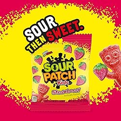 - SOUR PATCH KIDS Strawberry Soft and Chewy Candy tempts your taste buds with a twist on a classic flavor. These deliciously juicy fruit-shaped chewy candies are sweet and fruity, with just a little bit of sour. The fun strawberry shape adds excitement to your snacking and is the perfect summery addition to snack bowls. This sour candy is the perfect SOUR THEN SWEET treat end to your day, and it's a fun soft candy to serve at birthday parties, holiday celebrations and game nights. SOUR PATCH KIDS strawberry candy also makes a great movie theater candy to snack on during your favorite flick. Each bag of sour gummy snacks in this bulk candy case is sealed to ensure each piece stays soft, chewy and full of strawberry flavor.