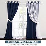 【Package Content】 Product 1 - 2 pieces grommet top double solid curtains with gauze sheer overlay, each measure 52"W x 84"L. Product 2 - 2 pieces grommet top double ombre curtains with gauze voile overlay, each measure 52"W x 84"L 【Product 1】 The curtains come with 2 gold curtain ropes. Each panel has a gauze sheer layer over a blackout curtain with 8 SILVER grommets(1.6-inch inner diameter)top. 【Product 1】 Double-layered curtains block out unwanted light and isolate outside peep. Not only makes you feel relax at home but also decorate your home. Perfect for kitchen, living room, bedroom, dining room, etc 【Product 2】 Navy blue ombre blackout curtains with white gauze sheers overlay. The sheer layer is not only soft to touch, but also maintain drape and no wrinkles, which is a perfect addition to your room 【Product 2】 Voile panel overlay makes your home decor elegance and unique. Combined design, so you only need one curtain rod. Multiple colors for choosing, suitable for different home style