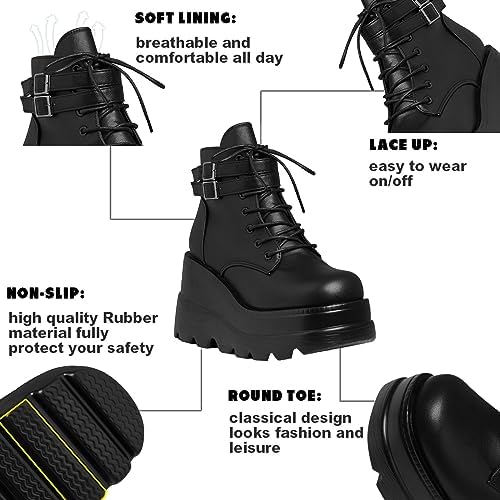 Tscoyuki Platform Ankle Boots for Women Chunky High Heel Booties Goth Round Toe Combat Boots Women Lace Up Motorcycle Wedges
