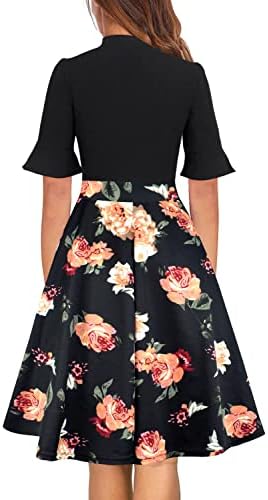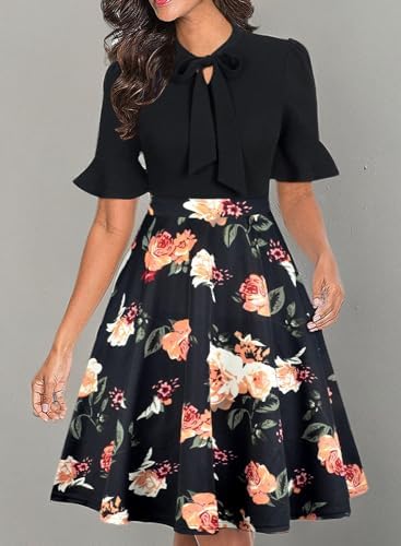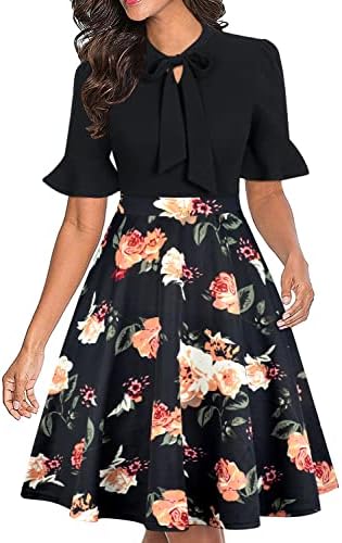 Womens Vintage Floral Fit and Flare Knee Length Teacher Curvy Hide Belly Business Office Professional Work Dresses S