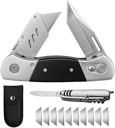 Folding Utility Knife with Sheath and 10 Razor Blades, Heavy Duty Box Cutter Knife with Dual Blades, Construction Knifes Electrician Knife for Carpet Cardboard Work, Pocket Knives Set Gift for Men