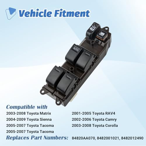 - 🚗【Compatibility】This automotive power window switch controller compatible with 2002-2006 Toyota Camry, 2003-2008 Toyota Corolla, 2003-2008 Toyota Matrix, 2004-2009 Toyota Sienna, 2005-2011 Toyota Tacoma; 2003-2008 Pontiac Vibe; 2004-2007 Scion xA, xB.