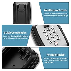 9 DIGIT COMBINATION LOCK: This security key safe box features a 9 digit combination, offering stronger protection than standard 4 digit locks. With over 1 million possible combinations, it helps prevent unauthorized access and keeps your keys and valuables safe SECURE & DURABLE LOCKBOX: Crafted from a high strength zinc alloy body, this key lock box is waterproof, rustproof, and weather resistant. It also includes a weatherproof cover that protects the digit dial from rain, snow, and ice, ensuring reliable performance in any weather LARGE CAPACITY: This lockbox measures 4.6 × 3.5 × 2.3 inches and offers ample room for 8 to 10 standard keys, car keys, access cards, ID cards, or other small personal items. Suitable for both indoor and outdoor use, it is ideal for homes, garages, warehouses, offices, apartments, realtors SIMPLE INSTALLATION: This wall mounted lock box comes with four screws and four expansion plugs, which can be screwed to any solid surface, such as a wall, fence or door frame. In addition, the soft silicone backing design helps prevent scratches or damage to the mounting surface PREVENT LOSS: This lock box provides a fixed and secure place for your keys, reducing the risk of loss from random placement or hiding. It also stores spare keys for quick access during emergencies, helping you avoid being locked out or delayed in important situations