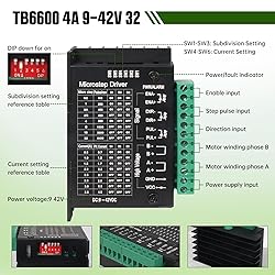 【Motor and TB6600 Driver wiring】Stepper motor's RED wire connects to driver's A+ port. Stepper motor's GREEN wire connects to driver's A- port. Stepper motor's YELLOW wire connects to driver's B+ port. Stepper motor's BLUE wire connects to driver's B- port. 【Control Card and TB6600 Driver wiring (X-axis as an example) 】Driver's "Pul+" connects to control card's XP+ pin , Driver's "DIR+" connects to control card's XD+ pin , Driver's " PUL- " pin and " DIR- " connection to USB Mach3 control card's " GND ". 【Low Noise/High Torque Hybrid Stepper Motor】23HS8430 2-phase stepper motor with a shaft diameter of 8mm, a current of 3A and an angle of 1.8°, is made of durable metal on the outside, and the perfect combination of rubber and rotor fills up the inner space and stabilizes the overall structure of the motor. The coils are made of pure copper enameled wire and the torque is up to 270oz-in (180N.cm/18kg-cm). The motor runs quietly and doesn't cause the generator to become too hot over a long time. 【Support Forward and Reverse Control Stepper Motor Driver】42/57 TB6600 stepper motor driver with input voltage anti-reverse connection and overheat/overcurrent short circuit protection, equipped with red warning light. through the 3-digit DIP switch, you can choose 7 subdivisions (1, 2 / A, 2 / B, 4, 8, 16, 32) and 8 subdivisions (0.5A, 1.0A 1.5A, 2.0A, 2.5A, 3.0A, 3.5A) current control. 【USB Interface, Drive-free Design 4-Axis Linkage Control Card】Output pulse frequency of 400KHz, using the minimum error interpolation algorithm, high processing accuracy. Supports up to 4 axes of linkage control, of which the 4th axis can be set as the slave axis. The control card can be connected to PC-compatible computers such as laptops, desktops, tablets and other computers with a USB interface. As long as Mach3 is running, the control card can be used without installing any drivers. 【Multi-function control card】With support for automatic home return, automatic tool setting, emergency stop input, limit switch access, spindle control (PWM mode and Him electrical mode), handwheel interface and other functions. Provide up to 12-way digital signal input, 4-way with optocoupler digital signal input and isolated relay output. Strong anti-interference and high reliability. 【Stable output 24V DC power supply】Over-current, over-voltage and overload protection, power supply stable power supply, electrical energy conversion rate of up to 90%, higher efficiency. Together with the heat dissipation fan design, shell hollow design, heat dissipation ability faster and stronger, more durable performance.