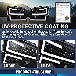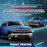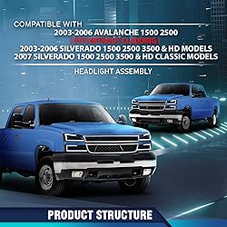 Compatibility - Compatible with 2003-2006 Chevy Silverado 1500 2500 3500 HD Models/2003-2006 Chevrolet Avalanche 1500 2500(Fits Models without Cladding Only)/2007 Silverado 1500 2500 3500(Fits Models with Halogen Headlights Only). Reference part number: 15199556, 15199557, 10366037, 10366038,GM2520185, GM2521185, GM2502224, GM2503224 Brighter & Cooler Lighting - The upgraded headlight assembly adds LED DRL, and uses special fine chrome plating to increase brightness and ultra-wide angle,making the vehicle more special. Safety & Durability - The micro-prism reflector and the chrome finish inside the headlight increase the reflectivity of the light, making it easier for the oncoming vehicle to notice you at night. The one-way vent design helps to dissipate accumulated moisture and prolong the life of the headlights. Sturdy Sealing Structure - The fully sealed heavy-duty housing is made of high-quality plastic,to ensure excellent weather resistance, impact resistance, and durability. Direct Replacement - Professional Installation would be highly recommended. No extra gaps after easy installation. Comes with a complete set of headlights, including Driver (Left) & Passenger (Right) sides. Bulbs are not included.