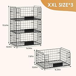 【3 Pack Large Wire Baskets】This Fruit and vegetable basket is a set with three wire baskets. The large space in each pantry basket is perfect for storing and organizing your things. Our metal storage bins can be used not only as vegetable basket for storing potatoes and onions or fruit basket, but also as snack rack and can rack in kitchen. What's more, this wire storage basket can also be used as a toy storage basket, clothes storage basket and bathroom storage basket in bedroom or bathroom. 【with Handles and Name Plates】Each fruit produce basket comes with two handles for easy portability and for perfect stacking, so it will also be more sturdy and stable. You can also name your items on the name plate that comes with each wire basket for quicker identification of your items. 【Stackable and Foldable】Our wire stackable storage bins can not only be stacked together as a 3-tier pantry basket, but also can be split into single or as two tiers depending on your needs and space. And this chip basket has a foldable design for easier storage and cleaning. Our wire pantry basket will maximize your space savings, at the same time keep your home tidy. 【Sturdy & Practical】Our metal food baskets are made of high quality carbon steel and have matte finish with premium black powder that won't fade or rust. This snack rack organizer is durable and has a strong load-bearing capacity, simple and stylish but sturdy and practical. 【WHAT YOU GET】You will get 3 pack wire baskets. The single basket size:16.34''L x 12.01'W x 7.87''H. The 3 stackable baskets size: 16.34''L x 12.01''W x 23.61''H. If you have any question, please contact us at any time and we will do our best to solve it to you.