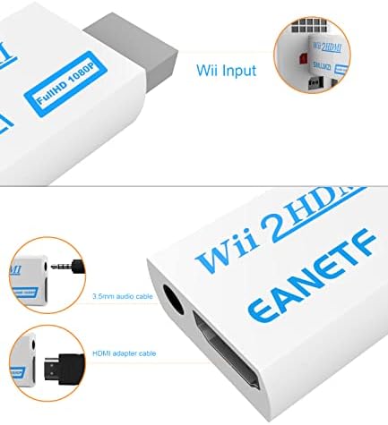 Eanetf Wii to HDMI Converter for Full HD Device with All Wii Display Modes - HDMI Cable Included ➤The new second-generation decoder chip, the picture quality is stable without delay, no splash screen, no ripple, high fidelity to restore the color more vivid. ➤Audio and video synchronization real-time transmission of high-definition without any delay. ➤The soul of the game machine. Enjoy your game paradise! ➤Learning, fitness, competitive games, parent-child interaction and so on. Break the time and space constraints, feel the real experience. Features: ①Video and audio in full digital HDMI format, no transmission loss! ② Supports all Wii display modes (NTSC 480i 480p, PAL 576i). ③HDMI upscale to 720p or 1080p high definition output. ④Provides advanced signal processing with great precision. Colors, resolutions! ⑤High quality, state of the art motion adaptive de-interlacing for 480i ,576i input. What You'll Get? - 1 x Wii to HDMI Converter. - 24 Months Product Warranty and Lifetime Technical Support, backed by 24/7 friendly customer service. - 1 x High Speed HDMI Cable(3.3ft).