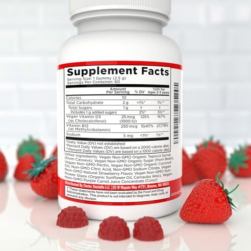 - SUPLEMENTO DE VITAMINA D3+B12 LA MEJOR DE DELICIOSOS GUMMIS DE DR. DANIELLE: Las gomitas veganas D3 + B12 de Dr. Danielle están hechas de liquen vegano y B12 bioactiva metilcobalamina. Pocas fuentes de alimentos en la naturaleza ofrecen vitamina D y la mayoría de la D3 en el mercado se obtiene del lanolín, grasa de lana de cordero. Las gomitas de Dr. Danielle ofrecen apoyo celular con una deliciosa gomita masticable, naturalmente saborizada a fresa.