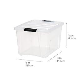 DIMENSIONS: 19.1" L x 15" W x 11.5" H (Inside: 14" L x 11.5" W x 10.6" H). Tapered design allows for easy nesting when not in use. MADE IN USA: Proudly crafted in the USA using quality, durable materials to keep your belongings safe and secure. SEE-THROUGH DESIGN: Transparent construction allows you to easily view contents without opening the lid. STACKABLE STORAGE: Securely locking lid keeps items protected and allows bins to be stacked to maximize space in your home, office, or playroom. SAFE & EASY ACCESS: Built-in pull handle makes it easy to slide out from shelves, while BPA-free, acid-free, and phthalate-free material ensures safe storage.