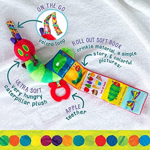 - ON THE GO TOY: This activity toy features a stuffed animal caterpillar (6”), textured apple teether, on-the-go strap, crinkle sounds, and an apple plush that rolls out into a small soft book (2.75” pages).