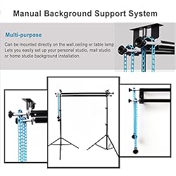 - Feather: Manual background support system is the best choice for small studio or home studiois,which is a perfect substitute for expensive electrical roller system. Two ways, hanging from the ceiling or using a lamp pole, it can be easily fixed where you want to install. Gear assembly to raise and lower background quickly and easily,.adjustable friction control to prevent paper from rolling out. The stands are durable and they easily hold the background Note that the set does not include a center pol Package including: 3x Pairs of Expansion Sticks (6 Total: 3 for Left and 3 for Right Side with Gears) 3x Roller Chains 3x Counterweights 2x Wall Mount Brackets with Hook 8x Expansion Screws How to install? Fix the hook bracket on the wall or celling with the expansion screws There is a bayonet on the expansion rod, which can be directly inserted into the hook and pressed down firmly Rotating expansion rod fixed to steel tube Put the chain on the gear and make the gears fit into the chain Turn the runner,the expansion rod will clamp the tube firmly hang the weights through the chain and pull the chains to elevate the backdrop If you have questions about the product, you can contact us.