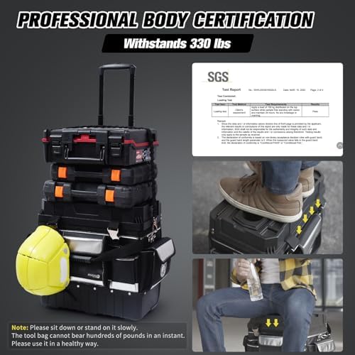 - Powerful Load Test: Use it healthily please sit or stand on it slowly, it's just a tool bag, cannot bear hundreds of pounds in an instant. stackable with various materials, the toolkit can hold up to 330 lbs (150 kg) and allows you to stand or sit on it briefly while using it outdoors.