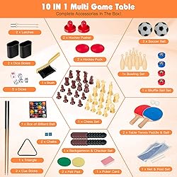 10 in 1 Game Table Set: Get endless fun in table games for adults and family including foosball, bowling, table tennis, hockey, billiard, shuffleboard, checker, poker, chess and backgammon! These arcade games for all ages creat exciting game nights at home for your family and friends. Easy to Assemble: Our multi game table only requires simple installation. Firstly, set up the foosball table, and then install supporting legs to billiard. Other games need no assembly, just put the game boards on the pool table and start to enjoy. TIPS: You can put the foosball or pool table directly on the floor and table top to play! Sturdy & Durable Construction: Made of premium MDF material, our combo game table features deformation-resistant legs with adjustable non-slip foot pads, ensuring high stability and durability. Besides, the ergonomic handle and fixing latches help provide better gaming experience. Stack Up Design for Space-Saving: The stackable design allows easier access to different games. Also, interchangable game boards can be stored between the pool base and foosball table, which saves space for game rooms. Plus, it's suitable for apartments, bars and pool halls as well. Overall dimension: 41.5” x 24” x 31.5” (L x W x H), billiard dimension: 40.5” x 23” x 27” (L x W x H). Perfect Gift & Multi Benefits: With all accessories included, our game table will be a wonderful birthday and Christmas gift for your little ones. Additionally, it not only enhances family relationship, but promotes hand-eye coordination, brain development and reduces screen time.