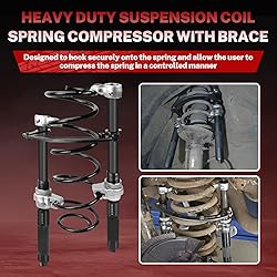 Double-Retention Anti-Drop System: This strut spring compressor kit features dual-protection safety with interlocking hook jaws and a secure locking mechanism. Its adjustable safeguard brace prevents accidental spring release under load and ensures parallel operation of removable tool components at all times Premium Material: Our coil spring compressor tool is constructed from 45# carbon steel. The rugged frame minimizes flexing, bending, and warping even under high tension, each pair of the spring compressor tool can withstand a load of up to 2645 lbs (1200 kg) Wide Application: An ideal solution for various vehicles, including trucks and large sedans. Avoid strut compressors with flimsy hooks that cause slippage or safety hazards. Compatible with springs 0–0.8 inches (0–20mm) in diameter. Verify spring size before use Product Information: This heavy-duty spring compressor tool has a wide jaw capacity of 2.7-10.6 inches (70-270 mm) and an adjustable holder suitable for 8.6-12.2 inches (220-310 mm) diameters coil Easy to Use: The screw compressor securely grips springs by rotating the easy-to-use hex nut. Use a 19mm hex socket or wrench. Always apply grease to threads before use. (Ensure even pressure on both sides — uneven force may cause tool detachment.)
