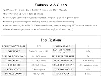 - Overview 2.13"capacitive touch e-Paper display, 5-point touch, 250×122 pixels.Display color: black, white Standard Raspberry Pi 40PIN GPIO extension header, supports Raspberry Pi Zero / Zero W. Supports waken up by user-defined gesture. No backlight, keeps displaying last content for a long time even when power down. Ultra low power consumption, basically power is only required for refreshing. Heat dissipation holes on the back,combined with thermal tape, effective heat dissipation. Specifications operating voltage--3.3V grey scale --2 interface--3-wire SPI, 4-wire SPI partial refresh time-- 0.3s full refresh time --2s display size --48.55 × 23.70mm refresh power --26.4mW(typ.) resolution --250×122 pixels viewing angle -->170° display color --black, white Touch point --5 (max) outline dimensions-- 69.15 × 38.90mm dot pitch --0.194 × 0.194mm standby current --<0.01uA (almost none) Online Tutorial/Online Document: n9.cl/wq54w Package Content 2.13inch Touch e-Paper HAT x1 ABS case x1 Screwdriver x1 Thermal tape x1 rubber feet 4PCS x1 Screws x2