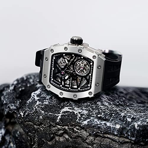 TSAR BOMBA Men's Automatic Watch Mechanical Tonneau Luxury Skeleton Watches for Men 50M Waterproof Analogue Work Mens Wrist Watch Unique Cool Design Square Silver Big Face Wristwatch Silicone Strap