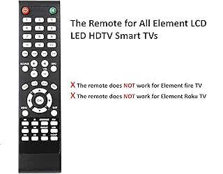 Universal Remote Control Replacement for Element LCD LED TVs. It does NOT wrok for Element Fire TV & Element Roku TV. No Setup Required. Simply insert 2 x AAA Batteries (Not Included), It is ready to use Compatible with Element TV models: ELCFT194 ELCFW324 ELDFW406 ELCFT262 ELDFW322 ELCFW326 ELCFW329 ELDFT404 ELCFW328 ELDFW464 ELDFT465J ELDFQ501J ELEFQ501J ELGFW601 ELDFW501 ELEFW193 ELEFJ191 ELEFT195 ELEFW195 ELEFS191 ELEFT193 ELEFJ243 ELEFS241 ELEFW264 ELEFT281 ELEFW325 ELEFT326 ELEFS321 ELEFJ321 ELEFQ402 ELEFW401A ELEFQ462 ELEFW462 ELEFC461 ELEFC463JA ELEFW705 ELEFQ391J ELDFT395J ELEFJ391 ELEFC401 ELDFQ501J ELDFC551J ELEFC461 ELDFT465J ELEFQ402 ELEFW705 ELDFW407 Brand new, High quality, Long Life Material, Fast Signal Remote Control fit for All Element LCD LED TVs The remote uses infrared technology. Ensure it is pointed toward the infrared sensor on your TV for proper functionality.