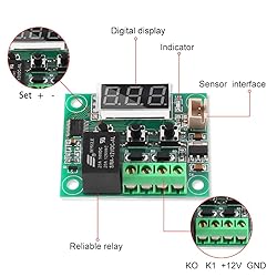 - The W1209 is an incredibly low cost yet highly functional thermostat controller. With this module, you can intelligently control power to most types of electrical device based on the temperature sensed by the included high accuracy NTC temperature sensor. Although this module has an embedded microcontroller no programming knowledge is required. 3 tactile switches allow for configuring various parameters including on & off trigger temperatures. The current temperature is displayed in degrees Centigrade via its 3 digit seven segment display and the current relay state by an on board LED.P0 :Cooling / Heating; Range: C/H; Default: CP1 :Hysteresis Setting; Range:0.1-15; Default: 2P2 :Highest Setting Limit; Range:110; Default: 110P3: Lowest setting Limit; Range:-50; Default: -50P4 :Temperature Correction; Range:-7~7℃; Default: 0℃P5: Delay Start Time; Range:0-10 Minute; Default: 0P6: High Temperature Alarm; Range:0-110; Default: OffWhen the Thermostat is power off, long press "- or +", you can restore the factory settingsSpecification:Temperature Control Range: -50 ~ 110℃Resolution at -9.9 to 99.9: 0.1℃Resolution at all other temperatures: 1℃Measurement Accuracy: 0.1℃Control Accuracy: 0.1℃Refresh Rate: 0.5 SecondsInput Power (DC): 12VMeasuring Inputs: NTC (10K 0.5%)Waterproof Sensor: 0.5MOutput: 1 Channel Relay Output, Capacity: 10APower Consumption:Static Current: <=35mACurrent: <=65mAEnvironmental Requirements:Temperature: -10 ~ 60℃Humidity: 20-85%Dimensions:48mm x 40mm x 14mm Package Included:2 * W1209 Temperature Controller Module 2 * Hard Plastic Case