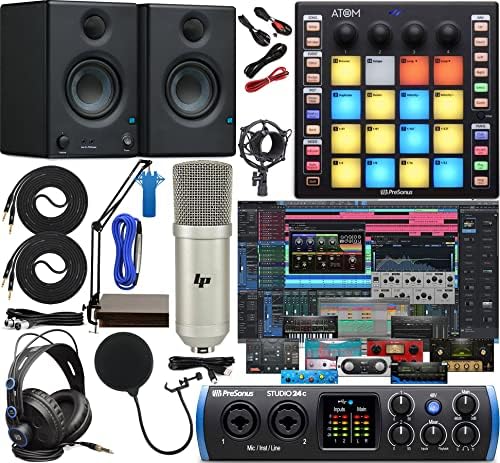 Great for recording studios, mobile musicians, guitarists, podcasters, and live streaming, the bus-powered Studio 24c 2-in, 2-out audio interface features 2 front-panel combo mic/line/instrument inputs with PreSonus XMAX-L solid-state mic preamps, 2 rear-panel line outputs, MIDI I/O, and onboard direct monitoring control. Whether you’re recording your first album or your hit podcast’s latest episode, the Studio 24c will help you sound your best. With two of pristine XMAX-L mic preamps for recording vocals; plus high headroom instrument preamps so you can connect your guitar or bass right to your interface; and professional input metering so you can keep track of your recording levels, the Studio 24c delivers amazing sound quality in a rugged, compact form factor. A complete home recording studio right out of the box, the Studio 24c audio interface comes with a complimentary license of award-winning Studio One Artist music production software, so you can get recording right away.You’re in controlATOM puts you in control of your music production software. Trigger loops and effects and play virtual instruments with 16 full-size, velocity- and pressure-sensitive RGB pads. Eight assignable pad banks let you, for example, assign your entire virtual drum rack to each pad within each bank. MIDI Keyboard mode, Note Repeat mode, and Full Velocity mode enable you to custom control your instruments. And with 4 programmable rotary encoders and 20 assignable buttons, you can navigate and set more parameters faster.Mic boom arm is dual suspension springs on each boom arm, protects the microphone from shaking, sinking and making noise and easy to install you can easily position the mic for the perfect voice.These nearfield monitors feature robust woven composite woofers that offer excellent low-frequency reproduction with next to no distortion and silk-dome tweeters that deliver smooth and balanced highs.