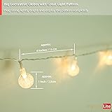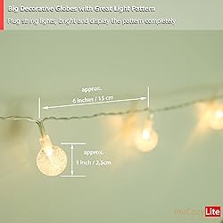 - LED String Lights, 20 Crystal Globes, Warm Lights Big Bubble, Multifunction with Timer, 3V Low Voltage Transformer, for Indoor and Outdoor, Extendable Specifications:Light count: 20 LEDLight color: Warm WhiteGlobe material: PlasticGlobe size: approx. 2.5 cm / 1 inchesGlobe Distance: 6 inches / 15 cmString Length: 3m String Lights, 5m Lead WireCan be extended: Max 3 stringsPower type: 3V low voltage transformerTimer: 6 hours on, 18 hours offFunctions: 8 Modes ETL Listed PlugETL listed means safer product. We pay great attention to the quality control of products.These projects comply with the U.S. Standards for Safe Use, which relate to structural, electrical safety and sensitivity, so you can use it with confidence. Automatic TimerAuto timer allows a simple press and go, 6 Hours Running and 18 Hours Off following by another 6 Hours Running, 24 Hours Cycling. Built-in memory chip will save the function till the next time light up. Durably MadeMade of very thick and sturdy plastic, these transparent cord are GS standard electrical cable. Waterproof screw connector and Waterproof string lights. ExtendableDesigned with male and female safe plug, these 10 ft globe string lights allow up to 3 packs to be connected in series without brightness loss. Extended length suffices in most decoration cases. Great Light PatternCrystal like globes with random decorative bubbles inside, generating warm shining lights from all angles. They help to create a warm and peaceful environment, decorate the specific area both indoor and outdoor.