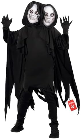 - disfraz de parca 100% poliéster para niños incluye una bata negra andrajosa con capucha, guantes negros puntiagudos y una máscara adjunta de 2 cabezas con cabeza autoadhesiva con ojos de malla para completar el aspecto espeluznante. El