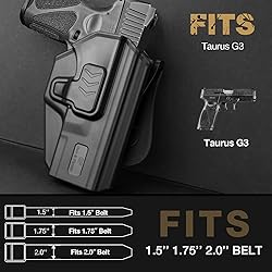 ★【OWB Holster Fit Taurus G3】 This holster is Tailor-made for Taurus G3. Our precise aluminum models guarantee high accuracy in shape and every detail so that your pistol can fit perfectly in the holster. ★【 Index-Finger Release Level II Retention System】Level II retention system means it won't release the weapon until you press the release button down as you draw to increase personal safety. ★【‘POSI-CLICK’ Retention & Adjustable Cant】When you holster your Taurus G3 Pistol, you'll hear a satisfying ‘CLICK’ let you know your weapon is securely holstered. Cant (or Carry Angle) is adjustable from -180 to +180 Degrees, allowing for a smooth and quick draw, customized for your needs, Appendix, Strong side, Behind the hip, or Cross draw carry. ★【Strong Durable Paddle】 Our gun holster fit 1.5-2.25 inch belt width. ★【Llfetime Warranty】No questions asked return policy and Lifetime Warranty. If for any reason you are unsatisfied, please feel free to contact our 24/7 Customer Services, we stand behind the quality of our work!