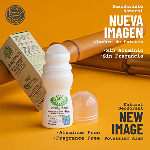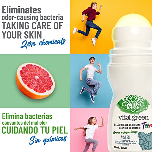 Vital Green - Natural Potassium Alum Crystal Stone Deodorant for Children with Grapefruit Extract. Gentle on Skin, Eliminates Odor and Non-Stain. Presentation Roll On 90g - 3 fl oz (1 Unit)