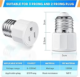 Light Bulb Socket Adapter 3 Prong Design: you will receive 2 pcs light socket adapter, which is 3 prong socket design, 3 prong sockets can be applied in both 3 plug and 2 plugs, a wider range of applications, this light socket outlet is more stable and convenient than 2 prong sockets Light Socket Adapter: when outside plugs aren't available, you can easily transform a light socket into a 3 prong polarized outlet, applied to create a place to charge cell phones while outside on or ear the porch, nice for electrical, household, Industrial, machinery and other appliances Product Rating: E26/ E27 socket outlet adapter voltage range: 0-125VAC, wattage: 1250W; This light bulb adapter is not suitable for use in wet locations Stable Material: the light bulb socket adapters are made of flame retardant PC material, heat resistant and long lasting, this light socket plug attached with US standard Easy to Install: you just need to turn off the fixture, remove the existing bulb, and screw the light socket plug adapter into the light socket