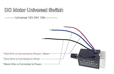 - Parameters:● Voltage: Universal 12V or 24V● Overload current: 10A● Rated power: 12V/120W, 24V/240W● Weight: 3.53ozProduct features:●PWM stepless speed regulation switch can completely turn off the output. Extra long knob screw to meet installation needs●The appearance is small and good-looking, and it supports adjustment of DC motors, motors, pumps, lamp beads, light strips, fans, etc●Comes with heat sink to meet heat dissipation requirementsWiring Connect:● Red wire: Connected to the positive pole of power supply and motor.● Blue wire: Connected to the negative pole of motor.● Black wire: Connected to the negative pole of power supply.Wiring precautions: (can not be reversed, wrongly connected)Product size:●Shell size: 2.5"*1.4"*1.28"●Knob diameter: 0.28"●Knob thread: 0.54"●Knob with knob cap total length: 1.18"●Cable length: 4.54"Package included:●1 × DC Speed Controller SwitchNOTE: The governor is suitable for 12 and 24V DC power.It cannot be connected to household 220V voltage.When using it, the positive and negative poles of the power supply cannot be reversed.