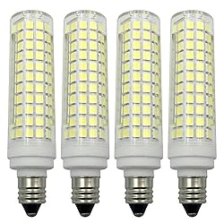 - Voltage: AC110V-130V Dimmable: Yes Material: Ceramic + PC Equivalent: 120 Watt Base: E11 mini candelabra base CRI: ≥80 Watts: 15W Beam Angle: 360 Degree Lumens:1500lm Color Temperature: Daylight White 6000K Lifespan: 20,000 Hours Dimension: (D)18mm*(H)80mm(0.7in*3.14in) Package: 4 Packs E11 LED Corn Bulbs Made of Ceramic and PC material with 136 pcs of 2835 SMD LED Chip,Ceramic housing helps heat dissipation quickly. 360° Beam Angle, Daylight White 6000K, CRI 80+, Dimmable, Work safely at AC110V-130V, High color rendering index, Ra>85, 15 watt e11 led lamp provides 1500 lumens. E11 LED Bulbs with screw base, easily fitted into various E11 base lighting fixture, the mini E11 Base doesn't fit to E12 candelabra base, please check your size before purchase and don't mix them. With a lifetime of up to 20,000 hours, can reduce the hassle of frequently replacing your light bulbs. Replace 120W incandescent bulbs by 15W LED, save up to 80% on electricity bill of lighting. Widely used for crystal chandelier, table lamp, pendant light, under cabinet light , wall scones, ceiling fan lighting, recessed lights, show lights, cabinet lighting, closet lights, etc.