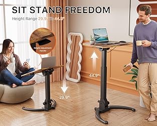 Unique Folding Board: The mobile laptop desk is designed with a tiltable board, supporting 0°-90° flip, can be used for reading, composing and painting, etc. Added non-slip pads to protect the laptop from falling when used at an angle Gas Spring Height Adjsutable: The height of the rolling computer desk can be adjusted from 29.9" to 44.9" with one-button lifting. Using pneumatic technology, the lifting process is smooth and fast, and easy to switch between sitting and standing positions Portable and Spacious Desk: The 28.7x19.6 inch desk has plenty of room for your frequently used things. Plus, the bottom knob helps you easily fold the table when you don't need it, saving you more space Recessed Wheels: Designed for lower sofa or bed, the base of the mobile laptop desk can be inserted into a gap as low as 1.9". The solid base adds extra stability to this foldable desk. Round table sides better protect you from bumps Sturdy Construction: The Portable Rolling Desk is made of cold rolled steel with a rust-resistant coating for extended use and load up to 22 lbs. Also, we provide you with all the necessary instructions and components to easily assemble your laptop stand