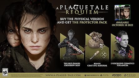 Al otro lado del mar, una isla llama... Embárcate en un desgarrador viaje a un mundo brutal y impresionante retorcido por fuerzas sobrenaturales. Después de escapar de su devastada tierra natal, Amicia y Hugo viajan hacia el sur, a nuevas regiones y ciudades vibrantes. Allí, intentan comenzar una nueva vida y controlar la maldición de Hugo. Pero, cuando los poderes de Hugo se reactiva, la muerte y la destrucción regresan en una inundación de ratas devoradoras. Obligados a huir una vez más, los hermanos ponen sus esperanzas en una isla profetizada que puede contener la clave para salvar a Hugo. Descubre el costo de salvar a los que amas en una desesperada lucha por la supervivencia. Ataca desde las sombras o desata el infierno, superando a enemigos y desafíos con una variedad de armas, herramientas y poderes sobrenaturales. ¡La versión física de A Plague Tale: Requiem incluye el DLC Protector Pack! ¡Parte del pie derecho en el siguiente capítulo del viaje de Amicia y Hugo, con una piel especial de ballesta, cosméticos exclusivos para Amicia y material de artesanía extra.