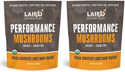 Laird Superfood Organic Performance Mushroom Blend with Chaga, Cordyceps, Lion's Mane and Maitake for Energy and Cognition, 3.17 oz. Bag, Pack of 2