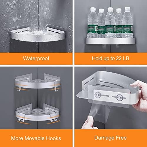 DUFU Adhesive Corner Shower Caddy with Hooks,Bathroom Shower Organizer, No Drilling Rust Proof Aluminum Shower Shelf for Inside Shower 2 Pack (Silver)