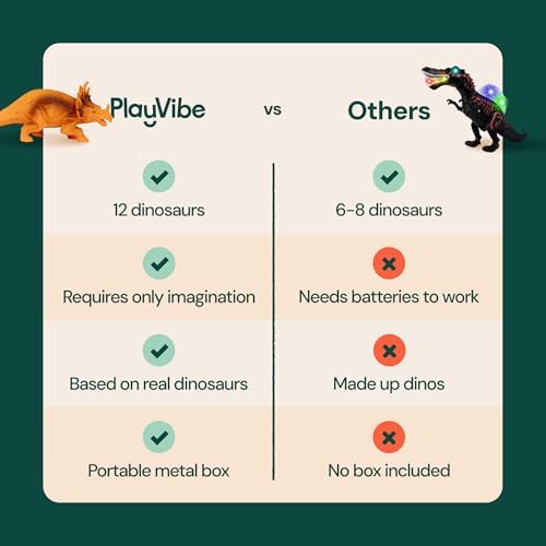 - Engage with Dinosaur Adventures: Immerse children in prehistoric excitement with PLAYVIBE Dinosaur Toys for Kids, featuring 12 detailed dinosaur figures and a stylish metal storage box. Ideal as dinosaur toys for kids 3-5, these figures spark creativity and exploration