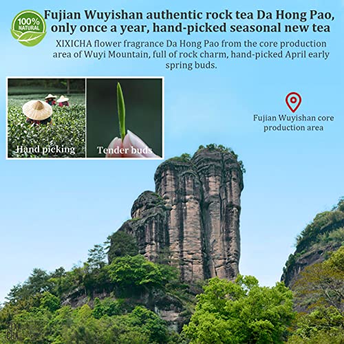 - XIXICHA Grade AAA wuyi mountain floral dahongpao tea, it is authentic wuyishan oolong tea, is produced in the core production area of Wuyishan Fujian. The tea tree grows on a rocky cliff,commonly known as rock tea. Made with traditional craftsmanship. Wuyi Mountain excellent and suitable growth environment creates the excellent quality of Dahongpao tea.