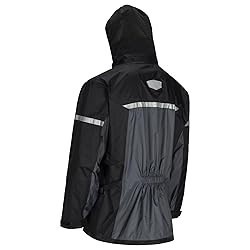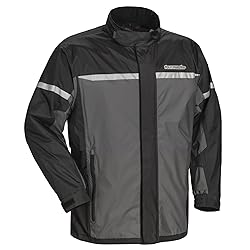 - Stay protected and comfortable in any weather with the Tourmaster Sentry Rain Motorcycle Jacket, a must-have for riders who refuse to let rain interrupt their journey. This jacket is crafted from a durable waterproof and breathable ripstop nylon shell with PU lamination and sealed seams, ensuring you stay dry even in heavy downpours. It features an Aqua-Barrier under-the-helmet hood that prevents water from rolling off your helmet and down your neck, while the extra tall collar with an easy-to-grab TPR puller provides additional protection. The microfiber-lined collar and cuffs offer comfort, and the 2-way main zipper with a full-length hook-and-loop storm front closure keeps rain out. For added ventilation, underarm exhaust vents help maintain breathability, while the poly mesh comfort liner enhances overall comfort. With dual waterproof exterior storage pockets and an internal storage pocket, this jacket offers ample space to keep your essentials dry. Adjustable waist belts and arm take-up straps allow you to fine-tune the fit, and the bottom hem shock cord drawstring ensures a snug and secure fit. Designed for practicality and style, the Tourmaster Sentry Rain Jacket is your reliable companion for wet weather rides.