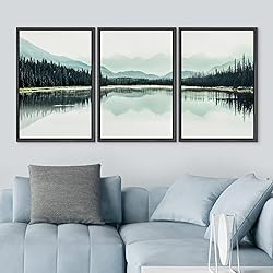 NWT Framed Canvas Print Wall Art Set Teal Mountain Range Lake Forest Landscape Nature Wilderness Photography Modern Art Rustic Scenic Relax/Calm for Living Room, Bedroom, Office - 24"x36"x3 Black