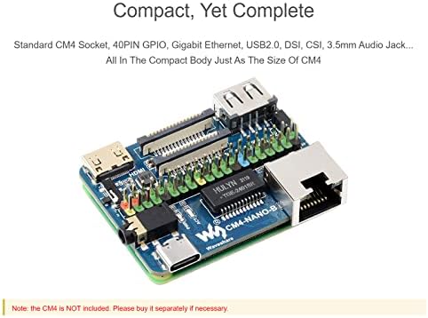 Nano Base Board (B) For Raspberry Pi Compute Module 4, Same Size As The CM4 1.Nano Base Board (B) For CM4 Suitable For Evaluating The Raspberry Pi CM4 Or Being Integrated Into End Products Base Board for Compute Module 4 Lite/eMMC 2.Compact, Yet Complete Standard CM4 Socket, 40PIN GPIO, Gigabit Ethernet, USB2.0, DSI, CSI, 3.5mm Audio Jack... All In The Compact Body Just As The Size Of CM4 Specifications CM4 SOCKET---suitable for all variants of Compute Module 4 NETWORKING---Gigabit Ethernet RJ45 connector CONNECTOR---Raspberry Pi 40PIN GPIO header × 1 USB---USB 2.0 Type A connector × 1 DISPLAY---MIPI DSI port × 1 (15pin 1.0mm FPC connector) CAMERA---MIPI CSI-2 port × 1 (15pin 1.0mm FPC connector) VIDEO---Mini HDMI port × 1, supports 4K 30fps output AUDIO---3.5mm jack STORAGE---Micro SD card socket for Compute Module 4 Lite (without eMMC) variants POWER INPUT---5V DIMENSIONS---56 × 41mm Package Content CM4-NANO-B x1 2*20PIN color-coded straight pinheader x1 Note 1.Development Resources is provided , please contact us if you have any problem . 2.the Compute Module 4 in the photo is NOT included.