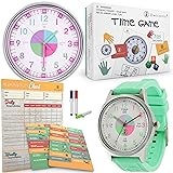 OWLCONIC Learning to Tell Time Bundle, Analog Wall Clock, Time Game, Mangetic Responsibility Chore Chart, Kids Wristwatch - Light Green