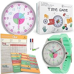 Suits ALL Ages with our Original Classic Design - Owlconic's analog wall clock – helps kids learn to read time the first foundational skill needed to understand time. Play is the Best way for Kids to Learn - cement learning time concepts in a fun way with Owlconic’s Time Game. When kids are having fun the learning sticks. The tools in this Time Game kit cover all time concepts including time language and caters for different learning styles. Using Real Life Activities to Build True Understanding - Owlconic's Responsibility Chore Chart for kids - places time into real life situations. Children develop a true sense of time as they relate it to real life daily activities. Consistent Regular Practice Builds Confidence - Owlconic's Light Green Kids Watch - is the perfect way for children to practice their time telling skills on the GO. The watch is specially designed to advance their time telling and math skills.