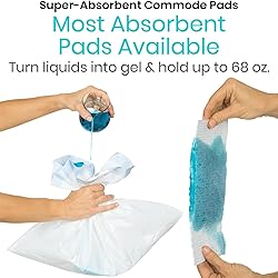 MOST ABSORBENT COMMODE PADS AVAILABLE: Reducing spills and splashes, our Vive Super Absorbent Pads are the perfect addition to standard commode pails liners. The quick-absorbing pads hold up to 35 fl oz. of liquid, turning it into an easy to dispose of gel. Each box contains 24 super-absorbent pads only. TRAPS UNPLEASANT ODORS: Ideal for bedside commode chairs, hospital and long-term care settings, the unscented absorbent pads neutralize unpleasant odors to keep the area smelling fresh. USE WITH ALL COMMODE LINERS: Perfectly sized for use with the Vive Commode Liners, the super absorbent pads are suitable for use with any commode or bedpan liner brand. Use the super absorbent pads while camping, hiking, in the RV and on the boat for hassle-free cleanup MEDICAL-GRADE MATERIALS: Our high absorbance pads are made with a medical-grade material for sanitary disposal of bodily fluids. VIVE GUARANTEE: 60 day guarantee so you can purchase now with confidence.