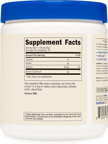 - Nutricost Polvo de Colostro Bovine 8oz es colostro puro y contiene 3 gramos de colostro en cada porción, 76 porciones.
