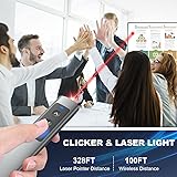- Why do You Buy The Presentation Clicker 1.The office presentation pointer not only gives you the ability to easily change the slides but with the red light pointer built in. You can give an explanation to all audiences or students that you're teaching. 2.The buttons of ppt clicker have a great feeling and are responsive, no delays. 3 Rechargeable presenter has a big clear laser beam. Light Range: 328FT/100M. 4.Cats and dogs love chasing laser light spot. Smartboard clicker has bright pointing light dot. 5.The clicker has a metal shell design, which is drop-proof and wear-resistant. 6.The slideshow clicker comes with handy carrying pouch and is a perfect gift for your friends, coworker, family or teacher must haves. 7.Magnetic Type-C & USB-A 2 in 1 Dongle. Power point clicker receiver is not only fit for devices with USB A interface, but also for devices with Type-C interface. 8.Presenter clicker wireless has sleek profile and light, so easy to keep in pockets or in clothes. 9.Powerpoint clicker is easy to use even for a beginner.