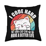 Vintage Programmer Coding Clothing Funny I Code Hard So My Cat Can Have A Better Life Throw Pillow, 18x18, Multicolor