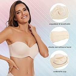 Silicone-Free Anti Slip and special type of band is sticked on top of the cups to prevent slipping and no worry about skin discomfort. Underwire cup makes sure this strapless in place The side and edge seams are elastic to prevent displacement and ensure a customized fit. The smooth and elastic material adds additional invisible lift up and support Minimizer bra cups can reduce protrusion, provide a smooth and flawless look. And busty woman can fit T-shirt and tight top perfectly Removable, convertible straps offer ultimate outfit versatility. Perfect for strapless evening dress, off shoulder dress or top, wedding, party, graduation prom etc. Ultra-thin unpadded and plus size cup, silky texture for your skin to breathe freely and more comfortable. Size from 38D to 44DD, especially suitable for women with large busts
