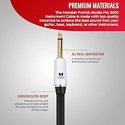 Industry-Defining Guitar Accessories: Crafted by Monster, the leader in electric guitar cords, our Prolink Studio Pro 2000 Instrument Cables promise enduring quality and style for every musician. Optimal Signal Transfer: The Monster Instrument Cable features a custom Monster connector with 24k gold contacts, ensuring ideal resistance and superior signal clarity. Extreme Accuracy: Time Correct windings and multi-gauge bandwidth balanced construction on this guitar amp cord reject interference - delivering precise, full-range frequency response for your guitar. Noise Reduction: MultiTwist construction with 95% copper-braid and carbon-infused dielectric shielding on the Monster Cable Guitar minimizes radio frequency and electromagnetic interference. Ergonomic Design: The heavy-duty shell of this guitar wire is ergonomically contoured, making it easy to handle and providing robust protection for solder joints. Ultra-Durable Protection: The thick Duraflex protective jacket shields your cable from physical damage, ensuring long-lasting durability and reliable performance on stage and in the studio. Guitar Cords with Versatile Length Options: Available in lengths from 8 in to 21 feet, you can choose the cable that suits your needs, ensuring flexibility whether you're in the studio or on stage. Ideal for All Musicians: Whether you're a professional guitarist or a passionate hobbyist, this Monster Guitar Cable is designed to elevate your musical journey with exceptional performance and reliability.