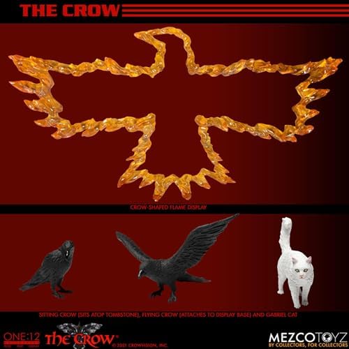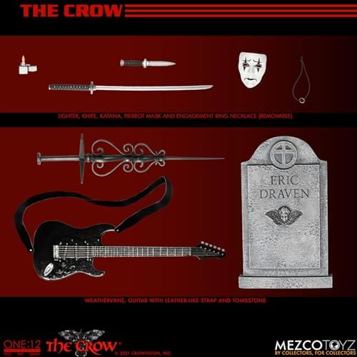 «Dígales que Eric Draven les envía sus saludos». Al levantarse de la tumba, ¡The Crow se une al colectivo One:12! The One:12 Collective The Crow presenta cuatro retratos de cabezas con diversas expresiones, como sorprendida, apretando los dientes, sonriendo y esculturas estándar. La vengadora sobrenatural viste una camisa negra, pantalones parecidos a la piel, un abrigo parecido a la piel y lleva el anillo de compromiso de su novia colgado del cuello en memoria de la mujer.
