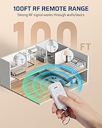 [Easy to Use] Plug and play wireless remote control light switch, no programming or tools required, just press the button ON/OFF to remotely control hard-to-reach sockets, and other home appliances; perfect for the elderly, pregnant women, and people with limited mobility or back pain, no need to bend over or get up and walk [Learning Function & Re-programmable] Transmitter and receiver have been pre-programmed for immediate use, signal non-interference, and you can freely add remote sockets (Same Model) to expand your remote control system with the learning function; the codes will be changed each time after re-programming by variable learning codes technology [Key Chain Remote Control &100 FT Control Range] Convenient to store and carry the remote control plug socket with an anti-lost keychain; strong RF signal works through walls and doors up to 100 feet (30m), suitable for open areas such as bedrooms, living rooms, and garages without interfering with other household appliances [Energy Saving & Safety] With included 3V/CR2032 battery, long-life and energy-efficient, compact design won't block other outlets; ideal for Christmas lights, Vac, TVs, table lamps, bedside lamps, floor lamps, fans, and other household appliances; built-in safety door in each socket prevents children from inserting fingers or other objects [Wide Compatibility] Up to 125V, 60Hz, 15A, 1875W Resistive, our wireless plug socket works with most household electrical appliances, offering reliable performance for everyday use