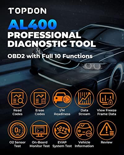 The TOPDON AL400 ArtiLink400 is a compact and user-friendly OBD2 diagnostic scan tool designed for DIYers and professional technicians. It features a 2.4-inch TFT color screen and supports live data graphing, allowing users to visualize engine performance and fault codes in real time. The device reads and clears generic (P0, P2, P3, U0) and manufacturer-specific (P1, P3, U1) trouble codes, retrieves freeze frame data, and displays vehicle information such as VIN, CID, and CVN. It also includes a one-touch I/M readiness button to quickly check emissions status.